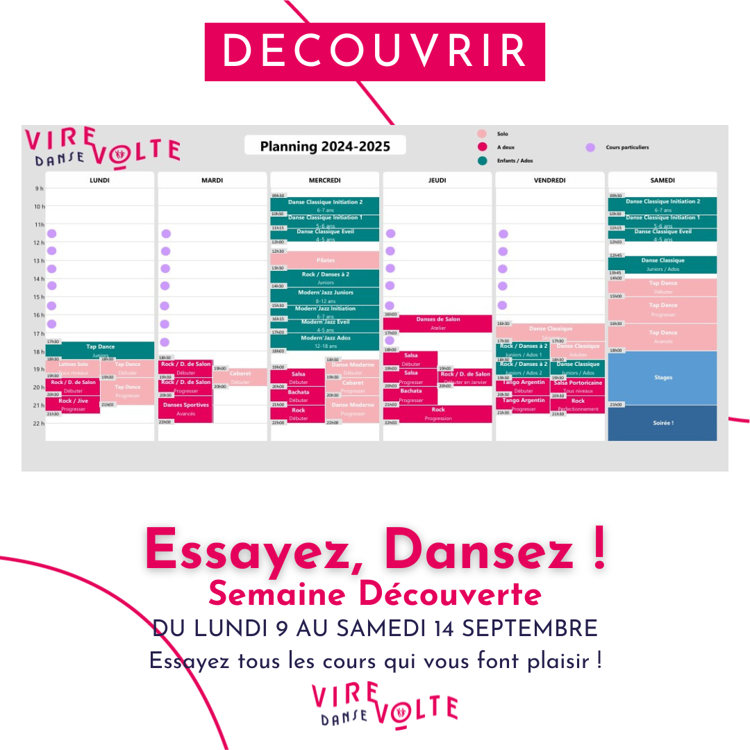 *Cours d'Essai Offerts, sur inscription par mail à contact@virevoltedanse.com ou par téléphone au 04 42 58 68 60.